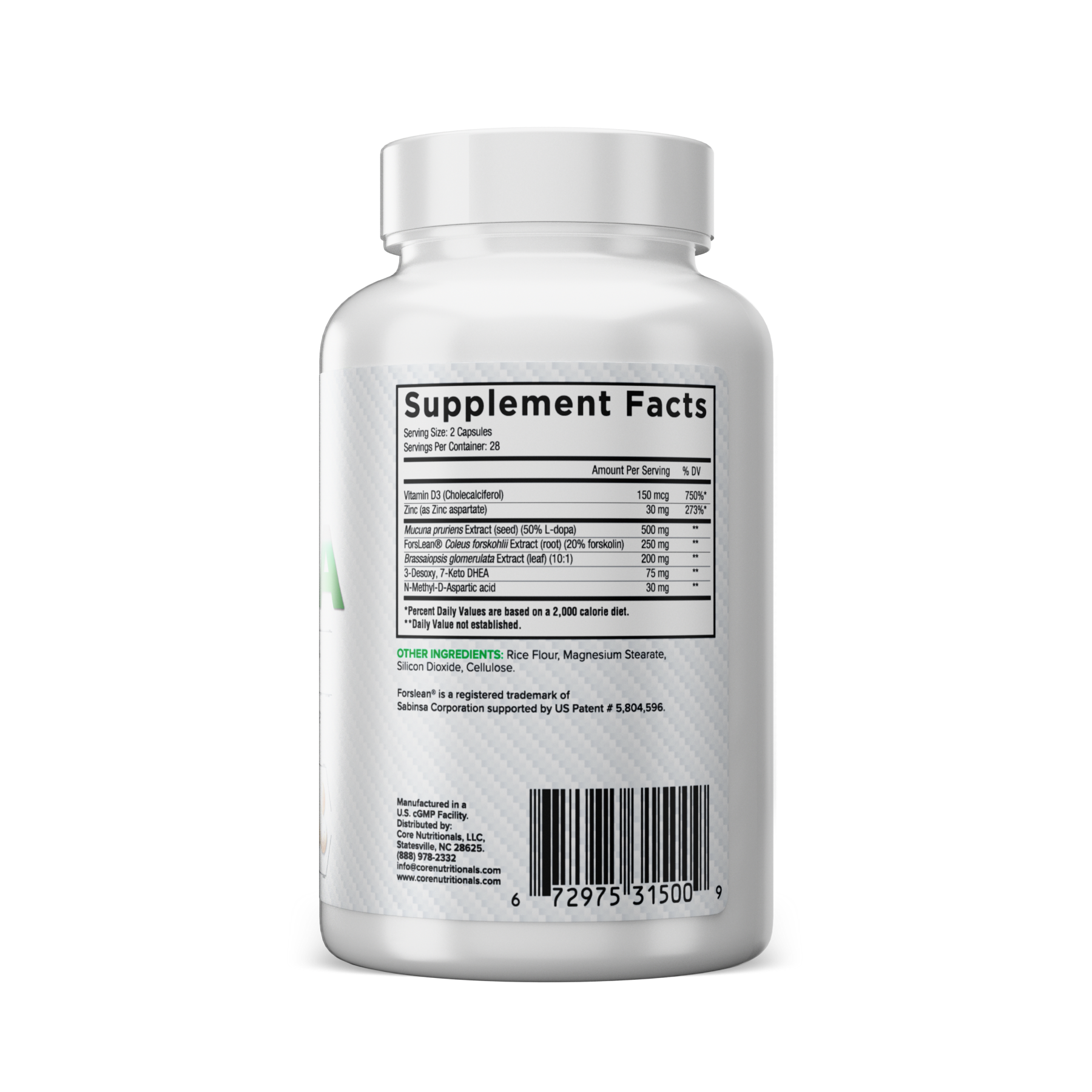 Vitamin D3 (cholecalciferol): Vitamin D3 is an essential hormone precursor that plays a vital role in many metabolic functions, including bone health, , support for immune and blood pressure health, lean body mass, and weight management). Clinical trials have even linked Vitamin D3 with an increase in overall health and well-being. Although some foods contain vitamin D, the human body generates most of its vitamin D needs from the skin through regular exposure to sunlight. Severe vitamin D deficiency is a significant and widespread problem, especially in North America. In addition to its well-known properties for supporting bone density and strength and general inflammatory response, Cholecalciferol is included in Core ALPHA because studies have shown that higher levels of vitamin D in men are correlated with higher levels of circulating testosterone.