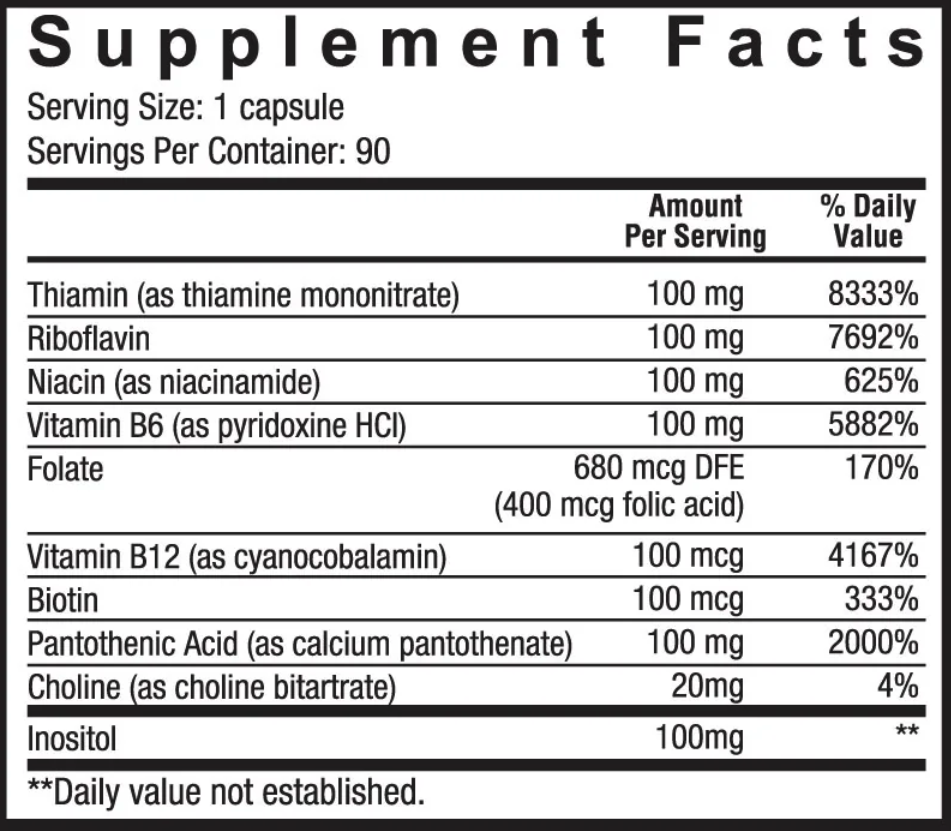 While rates of metabolism and clearance differ between each B vitamin, all B vitamins are water-soluble and are thus not stored in fat. As a result, the body simply excretes excess B vitamins in the urine and requires replenishment (from food or supplements) in order to maintain the cell functions to which B vitamins contribute. Along with choline and inositol added, collectively this group of nutrients are essential for maintaining normal energy levels, cognition, mood, bodily function, and well-being.