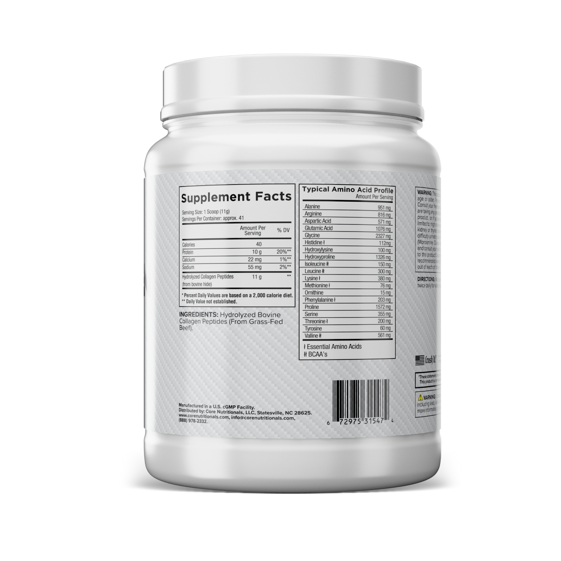 Collagen is by far the most plentiful protein found in the human body. It makes up the body’s skeletal framework, as well as provides integrity to ligaments, tendons, and other connective tissues found inside the body. It is also a primary component of healthy hair, skin, nails, as well as other important structures of the body. Collagen supplements have become increasingly popular as of late, but most people do not know that the type of collagen matters just as much as the quality of the source. Core has combined Collagen Types I and III from high quality bovine hide that works to provide strength for structures such as skin, tendons, bones, connective tissues, teeth, muscles, organs, and arteries.