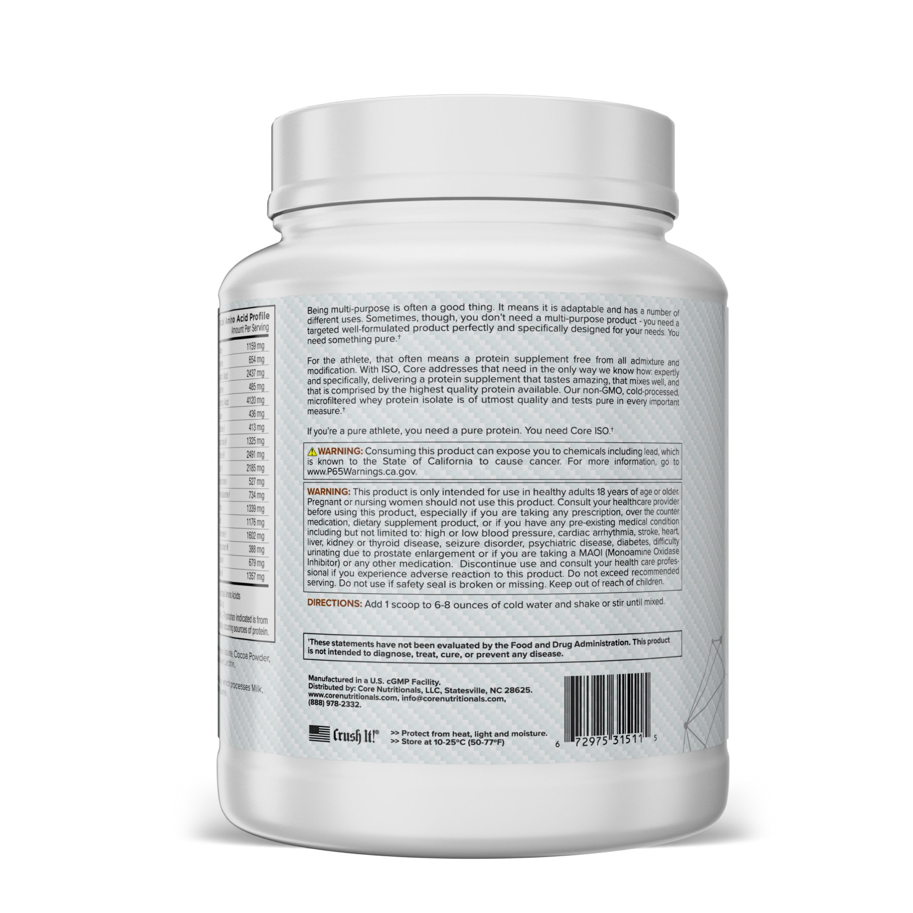 Core ISO is, simply put, the pinnacle. Our protein’s quality, level of purity, and most importantly, gourmet taste, make drinking a shake your favorite and most effective part of your training day!