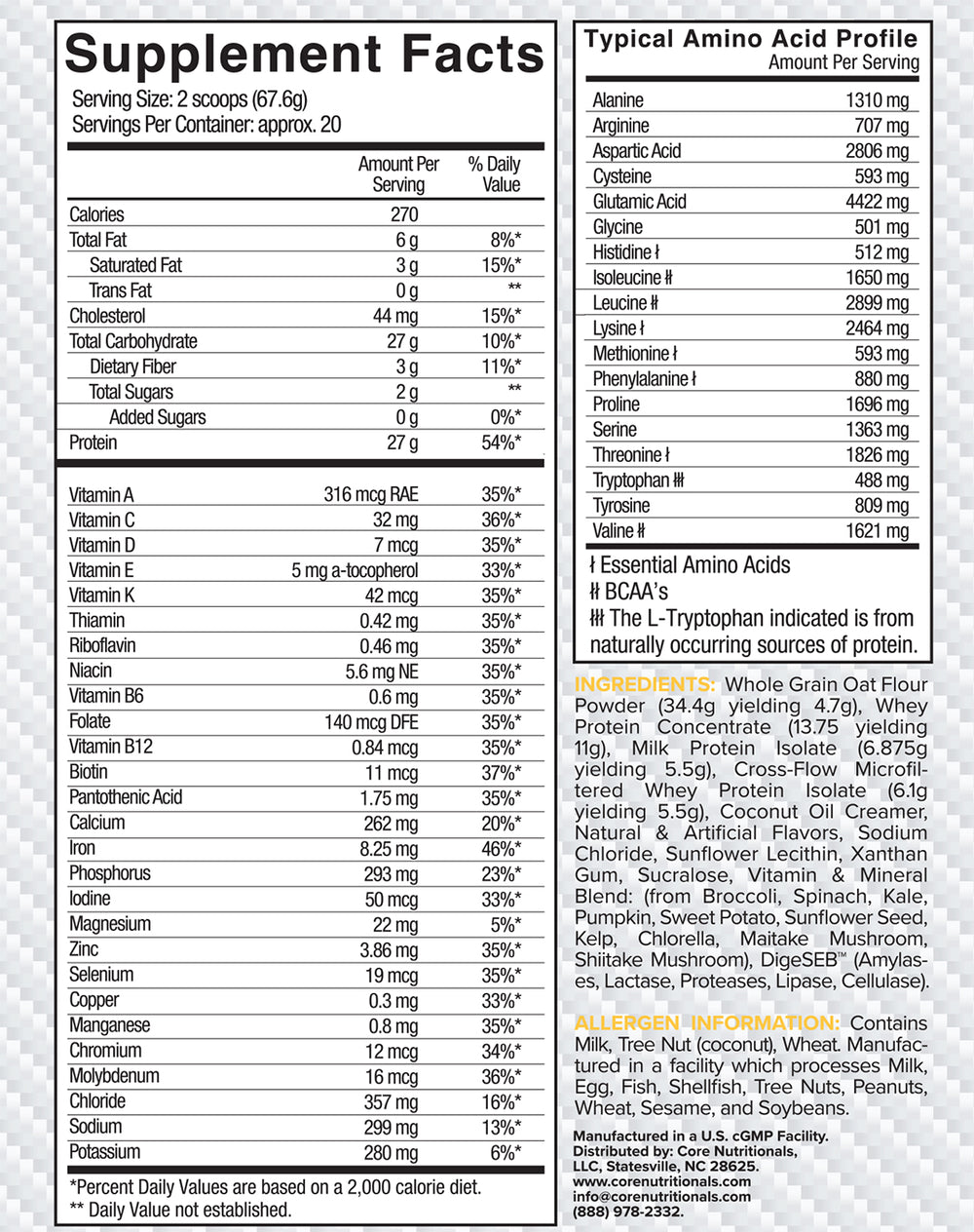Core MRP is designed with optimal results in mind. Our high quality, grain-sourced carbohydrates, multiple (and rich) protein sources, premium flavors, and a plethora of extras all come in a gourmet-tasting, instantized powder.