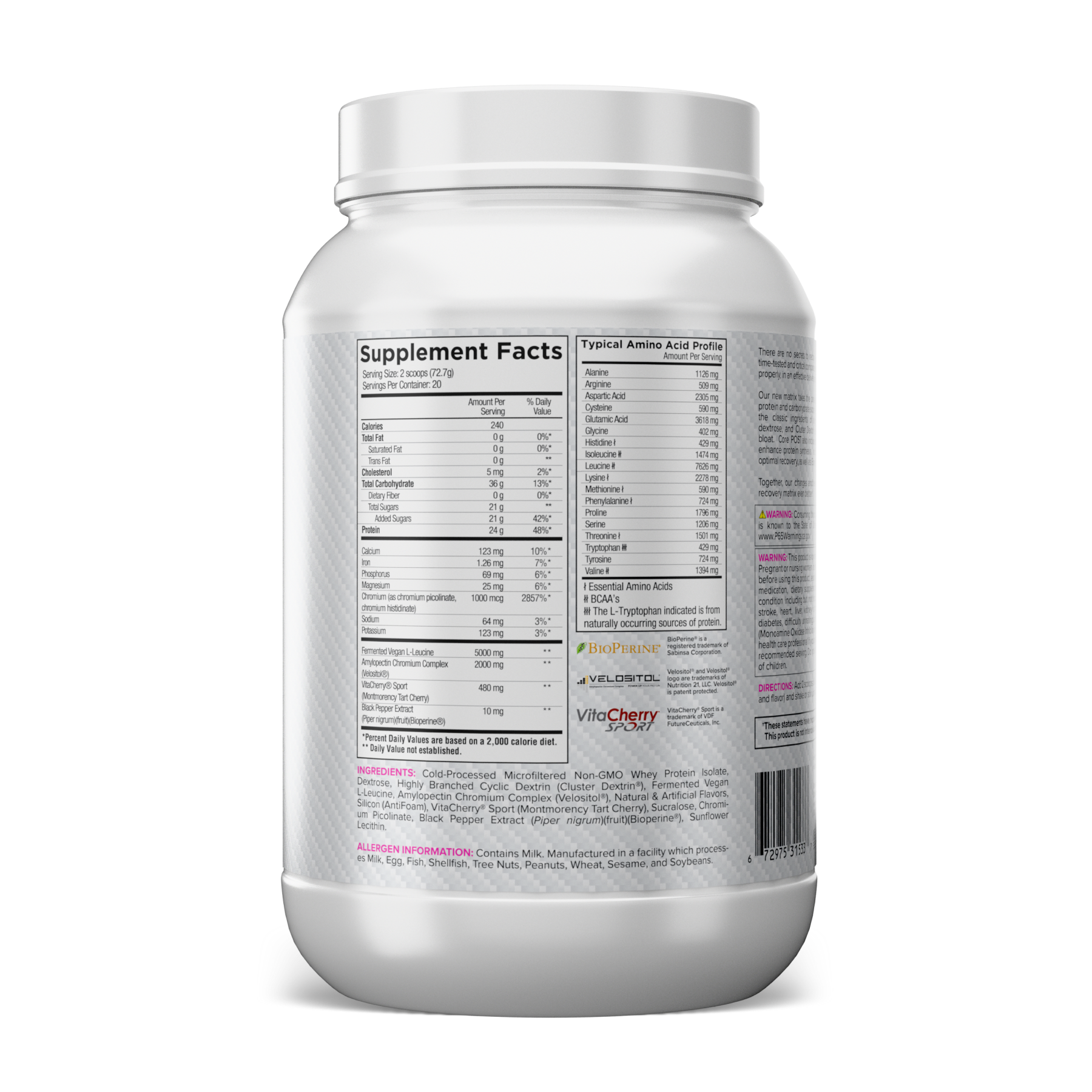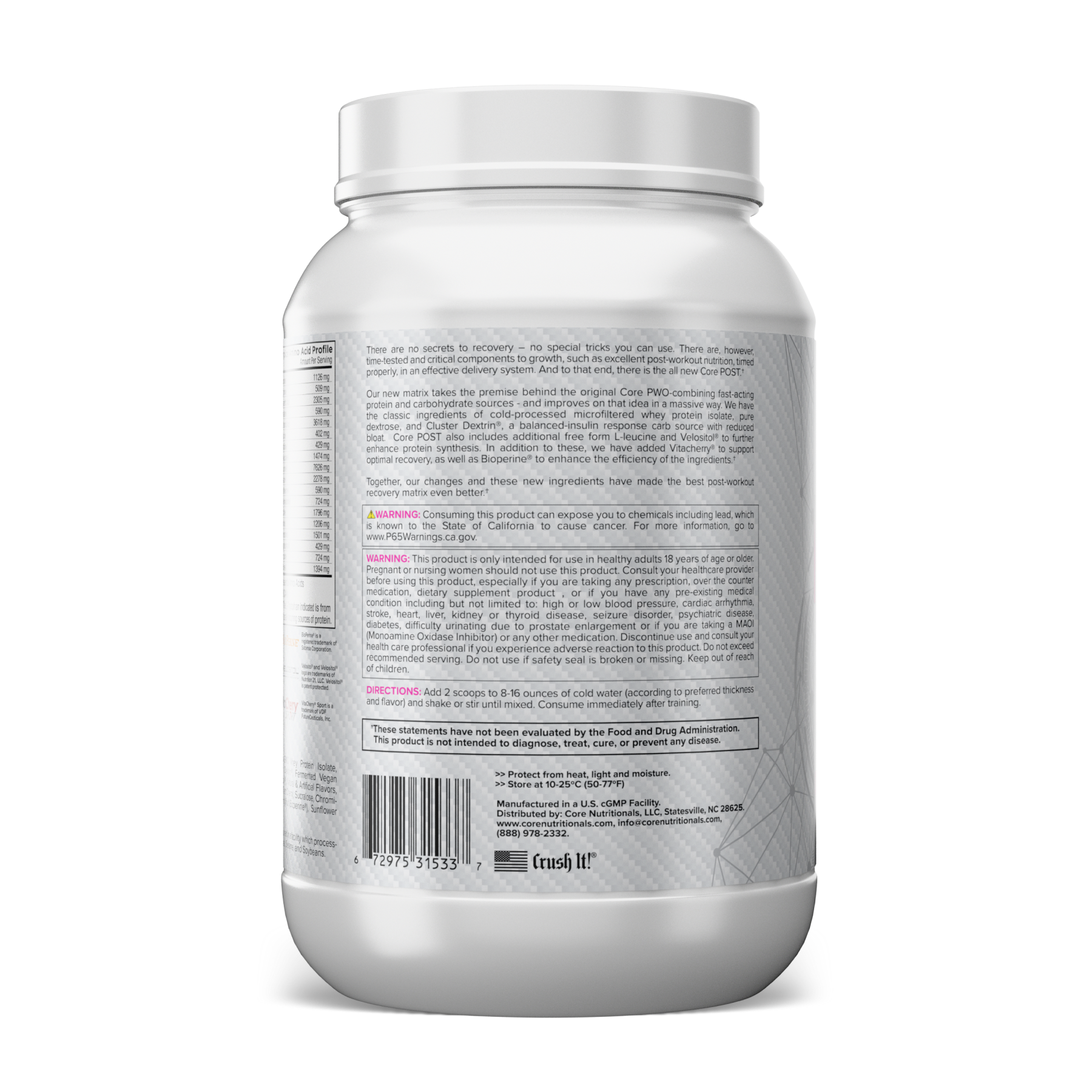 High quality, fast-digesting carbohydrates and protein have been shown time and again to induce the most optimal conditions for growth in clinical studies – and that is precisely what Core has attempted to emulate with Core POST. Core POST takes the guesswork out of post workout recovery, containing the fast-acting proteins and carbs (whey isolate, dextrose, and Cluster Dextrin®), along with other anabolic agents (free-form L-Leucine, Velositol®, VitaCherry®, and Bioperine®) needed to increase absorption in order to maximize muscle recovery after weight training. This combination of ingredients can quickly replenish muscle glycogen and shuttle much needed amino acids to muscle cells. Whether you are bulking up or slimming down, all of these ingredients are crucial for proper recovery.