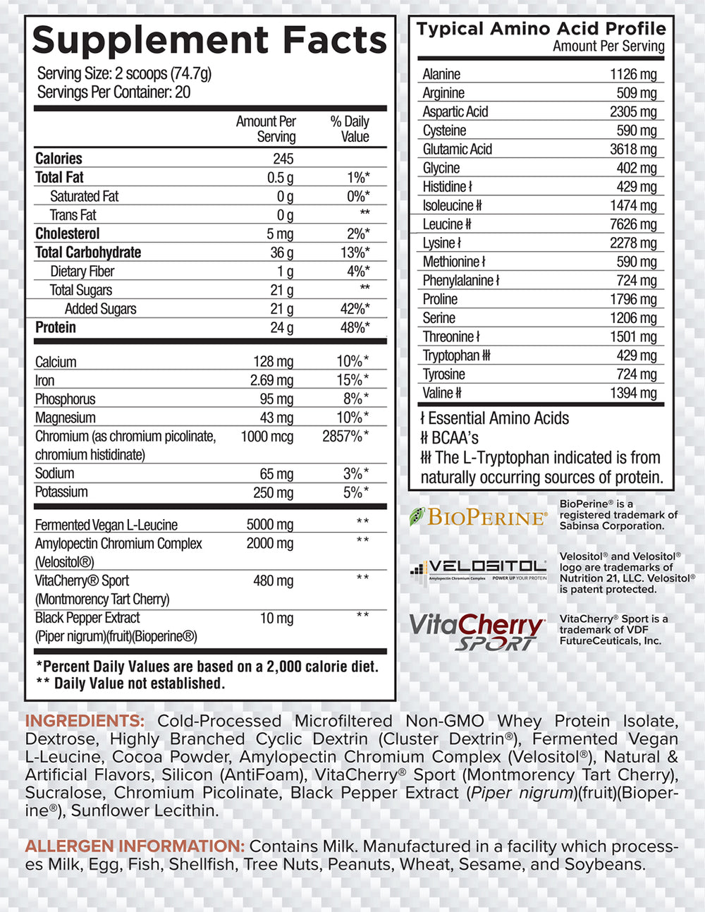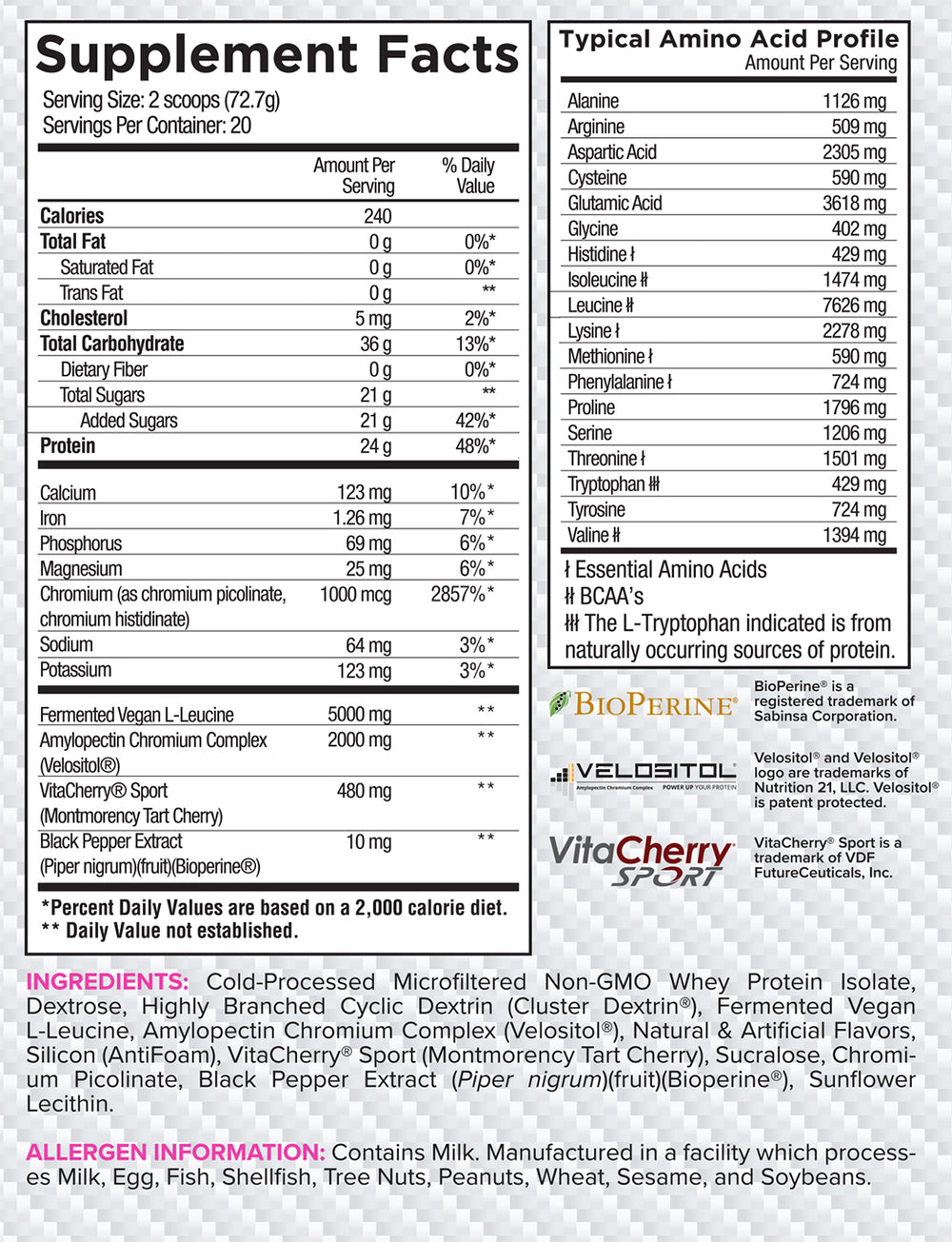 High quality, fast-digesting carbohydrates and protein have been shown time and again to induce the most optimal conditions for growth in clinical studies – and that is precisely what Core has attempted to emulate with Core POST. Core POST takes the guesswork out of post workout recovery, containing the fast-acting proteins and carbs (whey isolate, dextrose, and Cluster Dextrin®), along with other anabolic agents (free-form L-Leucine, Velositol®, VitaCherry®, and Bioperine®) needed to increase absorption in order to maximize muscle recovery after weight training. This combination of ingredients can quickly replenish muscle glycogen and shuttle much needed amino acids to muscle cells. Whether you are bulking up or slimming down, all of these ingredients are crucial for proper recovery.
