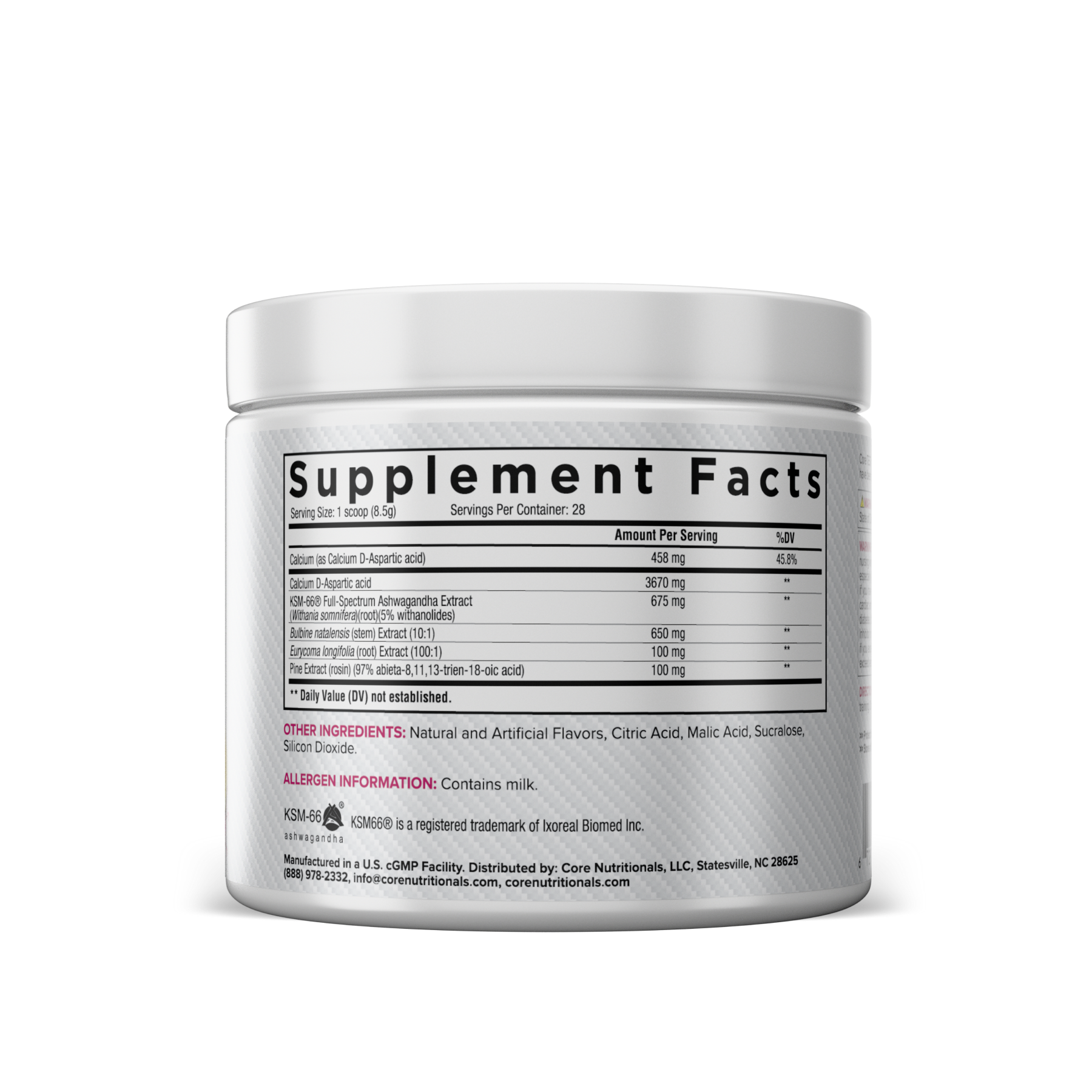 In recognition of the potential physiological benefits of withanolides, Core Nutritionals selected KSM-66® to include in its HARD formula. KSM-66® is a full-spectrum Ashwaghanda extract, standardized for 5% withanolides – meaning that KSM-66® not only includes the full range of biologically active compounds within Ashwaghanda, but also that it contains the highest currently available concentration of the principally active withanolides (5%).