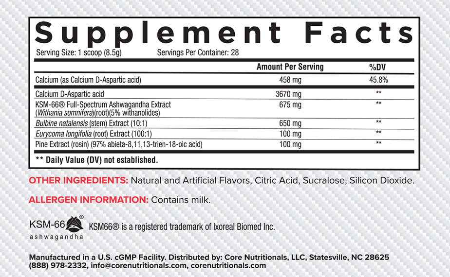 In recognition of the potential physiological benefits of withanolides, Core Nutritionals selected KSM-66® to include in its HARD formula. KSM-66® is a full-spectrum Ashwaghanda extract, standardized for 5% withanolides – meaning that KSM-66® not only includes the full range of biologically active compounds within Ashwaghanda, but also that it contains the highest currently available concentration of the principally active withanolides (5%).