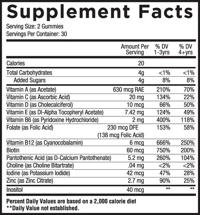 These delicious naturally flavored gummies were formulated to give our growing children 13 essential nutrients required for optimal growth and development.