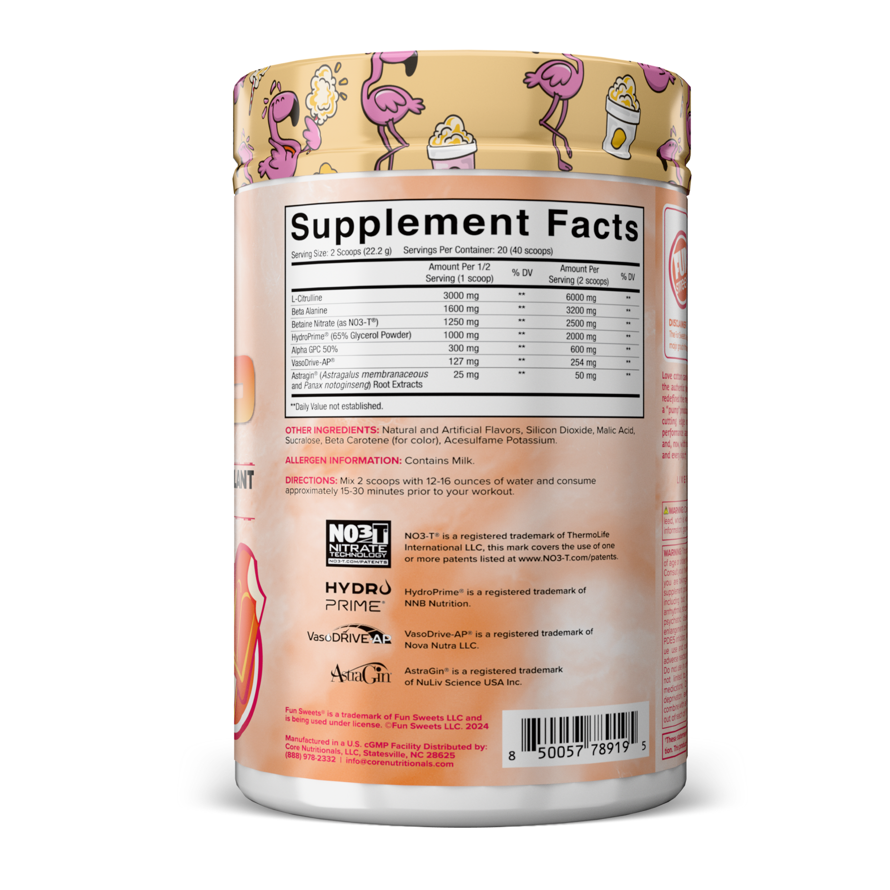 Core PUMP’s emphasis is what we call a “performance pump” – that is, increasing localized blood flow with a purpose. And the purpose is delivering real, measurable increases to key markers in exercise physiology, such as total time to exhaustion and peak power. We achieve the performance pump in Core PUMP by including ingredients that not only increase dilatory tone – and therefore elicit the “pump” effect – but do so while delivering real performance benefits. Beta Alanine, for example, is well-established to increase endurance, stamina, and peak power output – but it additionally increases blood flow. L-Citrulline is well-established to increase blood flow, but it also increases peak power output. In other words, each ingredient in Core PUMP facilitates the dual purpose behind the performance pump: delivering you the gratifying feeling of a pump, but also servicing your goal of progression.