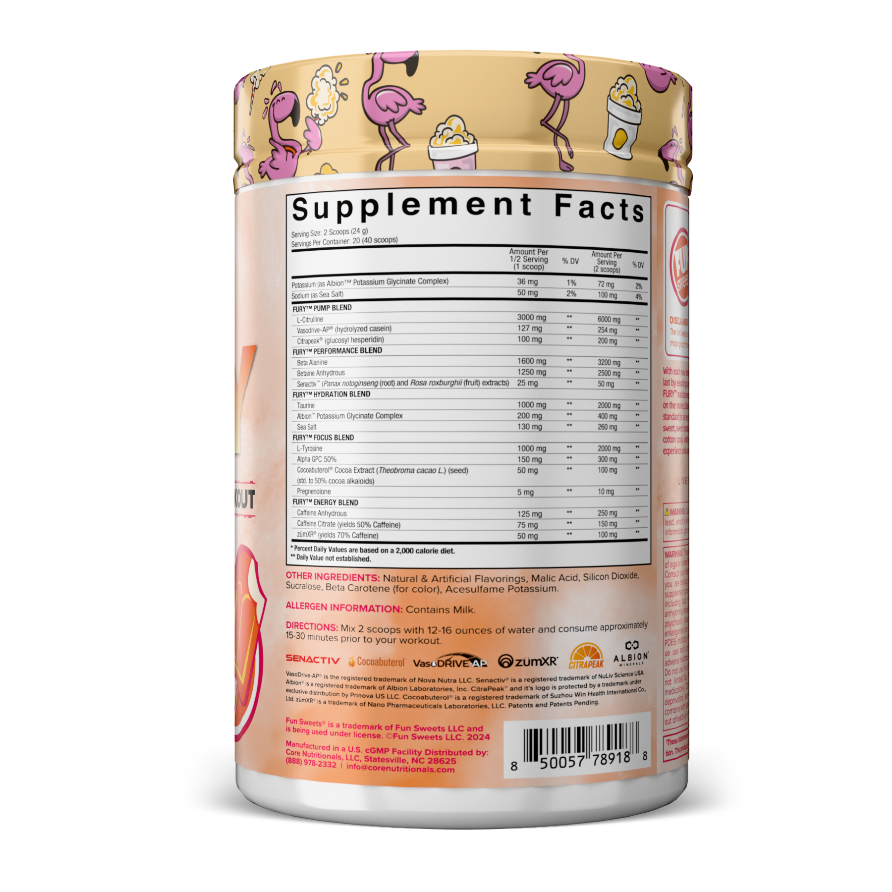 Core FURY Version 2 is a meticulously crafted combination of key ingredients created to boost athletic performance, hydration, mental clarity, and energy. For athletic performance, muscle pumps, and athletic performance, ingredients such as L-Citrulline, VasoDrive-AP®, Citrapeak®, and Senactiv™, among others, are included at or above serving sizes suggested by clinical research. These ingredients have repeatedly demonstrated improvements in blood flow, hydration, power output, VO2 max, and time to exhaustion. For cognitive capacity, clarity, and focus; L-Tyrosine, Alpha GPC 50%, Cocoabuterol®, and Pregnenolone are also included at, or above, serving sizes suggested by research. Studies using these ingredients have shown to increase working memory, enhance focus, and reduce cognitive fatigue.