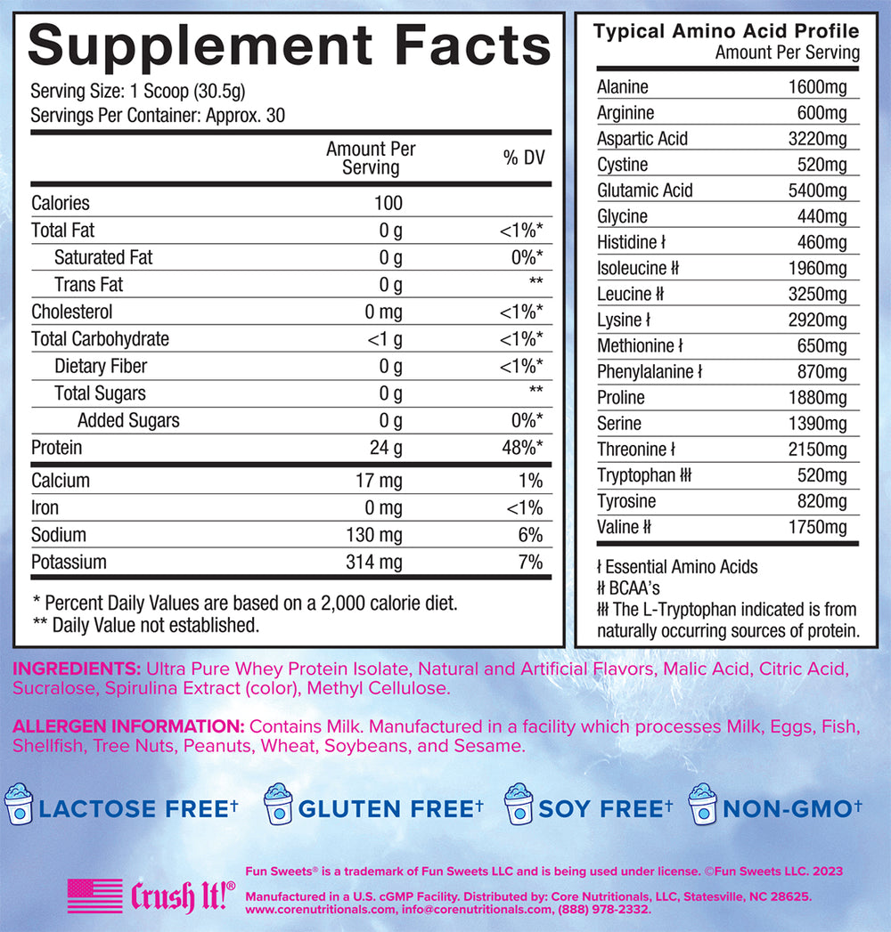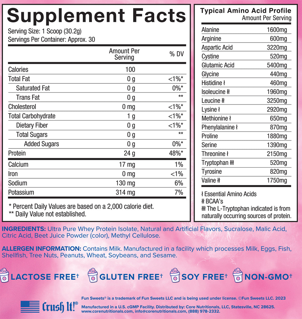 Introducing our latest innovation, Fun Sweets Cotton Candy® Clear Whey Protein Isolate! Elevate your protein intake with this unique blend that not only packs a powerful punch of 24g of high-quality whey protein isolate per serving, but also indulges your taste buds with the authentic and delicious essence of classic cotton candy. Treat yourself to a new kind of post-workout experience that combines the best of both worlds—efficacious protein to support your muscle recovery and the unmistakable sweetness of cotton candy, to make each sip an experience worth celebrating. With its crystal-clear formulation and vibrant flavors, this whey protein isolate takes post-workout nutrition to a whole new level, ensuring that your fitness journey is not only effective but also deliciously fun. But don't think you can only enjoy these amazing flavors after a grueling workout. You can savor the sweet taste of Fun Sweets® ISO Clear any time! Get ready to redefine your protein game with the amazing flavors of Fun Sweets Cotton Candy®, where smiles are always guaranteed!