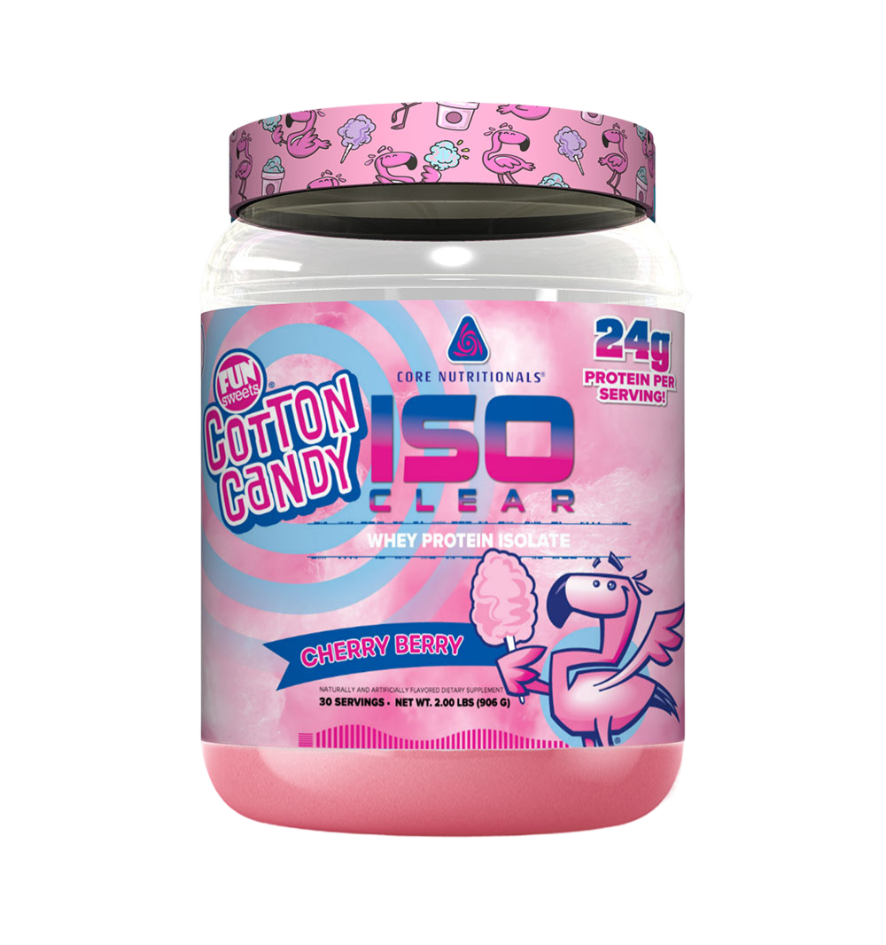 What is clear whey? Clear whey protein is still derived from whey, but what sets clear whey protein apart is its unique processing method that removes fats and carbohydrates, resulting in a clear and transparent liquid. This form of whey protein offers a convenient and refreshing alternative to traditional whey protein powders, which as mentioned above, often have a milky taste and appearance. Even with this more rigorous processing method, clear whey protein still retains all the high quality protein content of traditional whey, providing essential amino acids that support muscle recovery and growth. For individuals looking for a light and easily digestible protein source, but having a more juice like consistency and flavor profile, Clear Whey can be a great option. Core Nutritional’s® has finally entered the clear whey space with ISO CLEAR! Offering two amazing flavors with our partners at Fun Sweets Cotton Candy® you can now enjoy these sweet carnival flavors anytime, anywhere and reap the benefits of high quality and ultra-pure whey protein isolate!