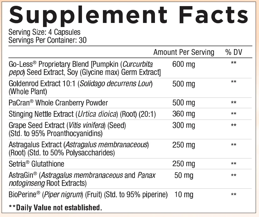 Go-Less® is a clinically studied blend of pumpkin seed extract and soy germ extract, that has been specifically formulated to support the health and function of the kidneys and bladder. As a natural supplement, Go-Less® can offer an effective approach to managing urinary tract health, reducing time for bladder emptying, and improving overall quality of life.