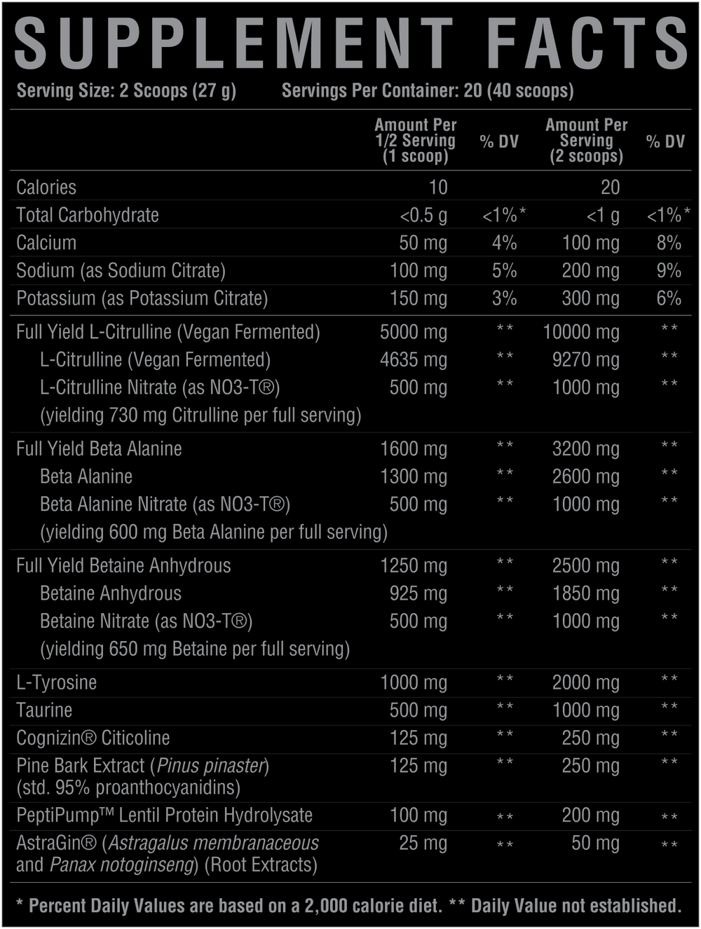 L-Citrulline (fermented) — 10,000 mg (with 9,270 mg straight L-citrulline + nitrate-bound yield)