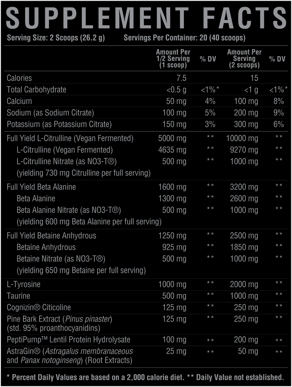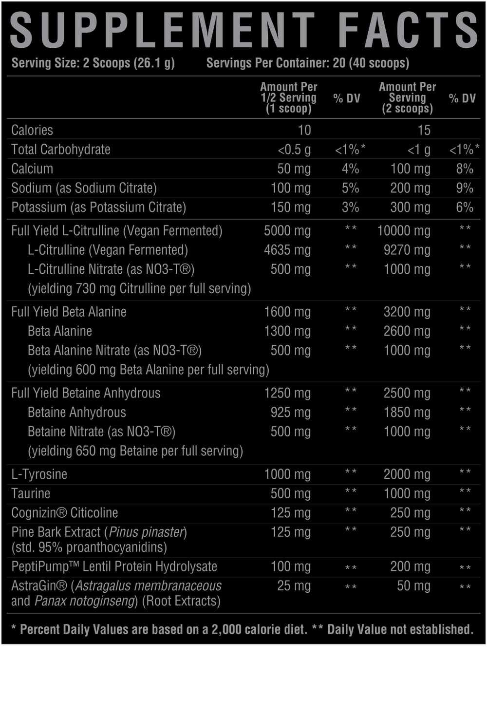 Beta-alanine — 3,200 mg (with 2,600 mg straight + nitrate-bound yield)