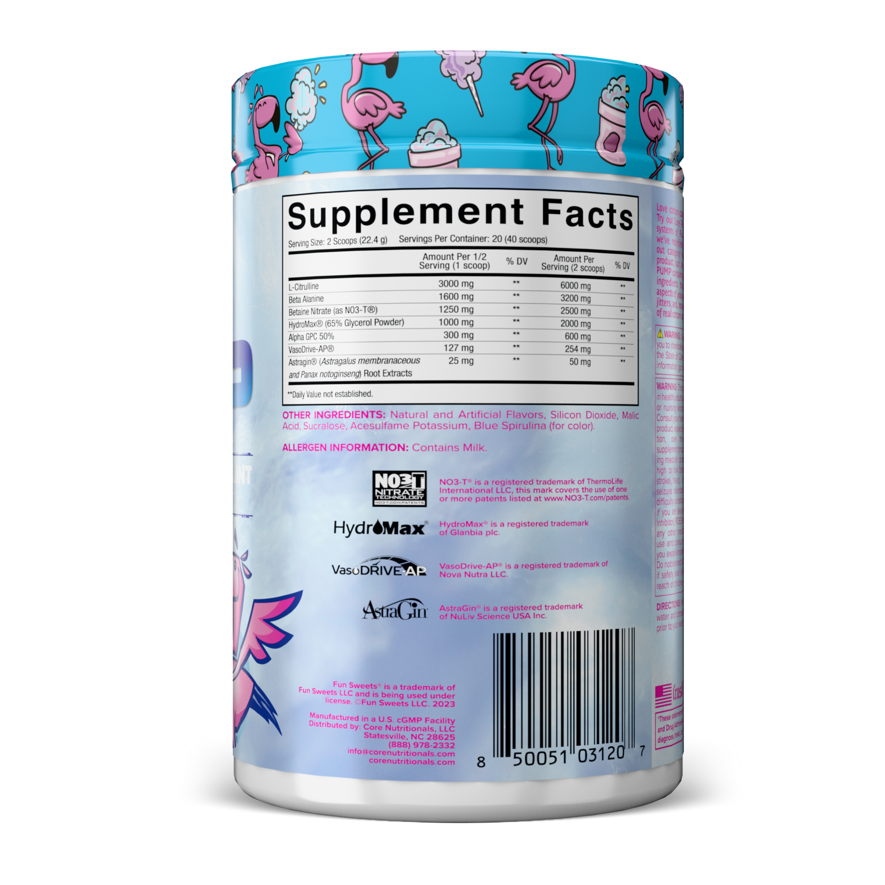 Core PUMP’s emphasis is what we call a “performance pump” – that is, increasing localized blood flow with a purpose. And the purpose is delivering real, measurable increases to key markers in exercise physiology, such as total time to exhaustion and peak power. We achieve the performance pump in Core PUMP by including ingredients that not only increase dilatory tone – and therefore elicit the “pump” effect – but do so while delivering real performance benefits. Beta Alanine, for example, is well-established to increase endurance, stamina, and peak power output – but it additionally increases blood flow. L-Citrulline is well-established to increase blood flow, but it also increases peak power output. In other words, each ingredient in Core PUMP facilitates the dual purpose behind the performance pump: delivering you the gratifying feeling of a pump, but also servicing your goal of progression.